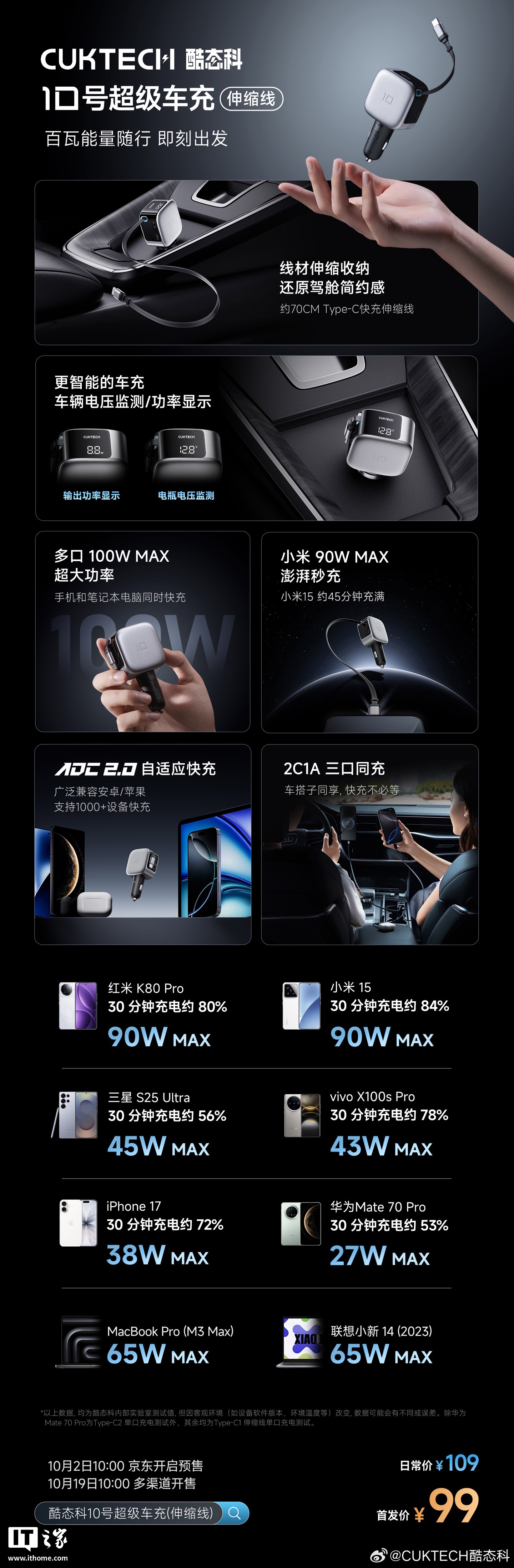 IT之家 9 月 29 日消息,酷态科官方微博现已公布酷态科 10 号超级车充「伸缩线」,该产品采用 2C + 1A 设计,将于 10 月 2 日 10 点开启预售,10 月 19 日 10 点首销,标准价 109 元,首发价为 99 元。